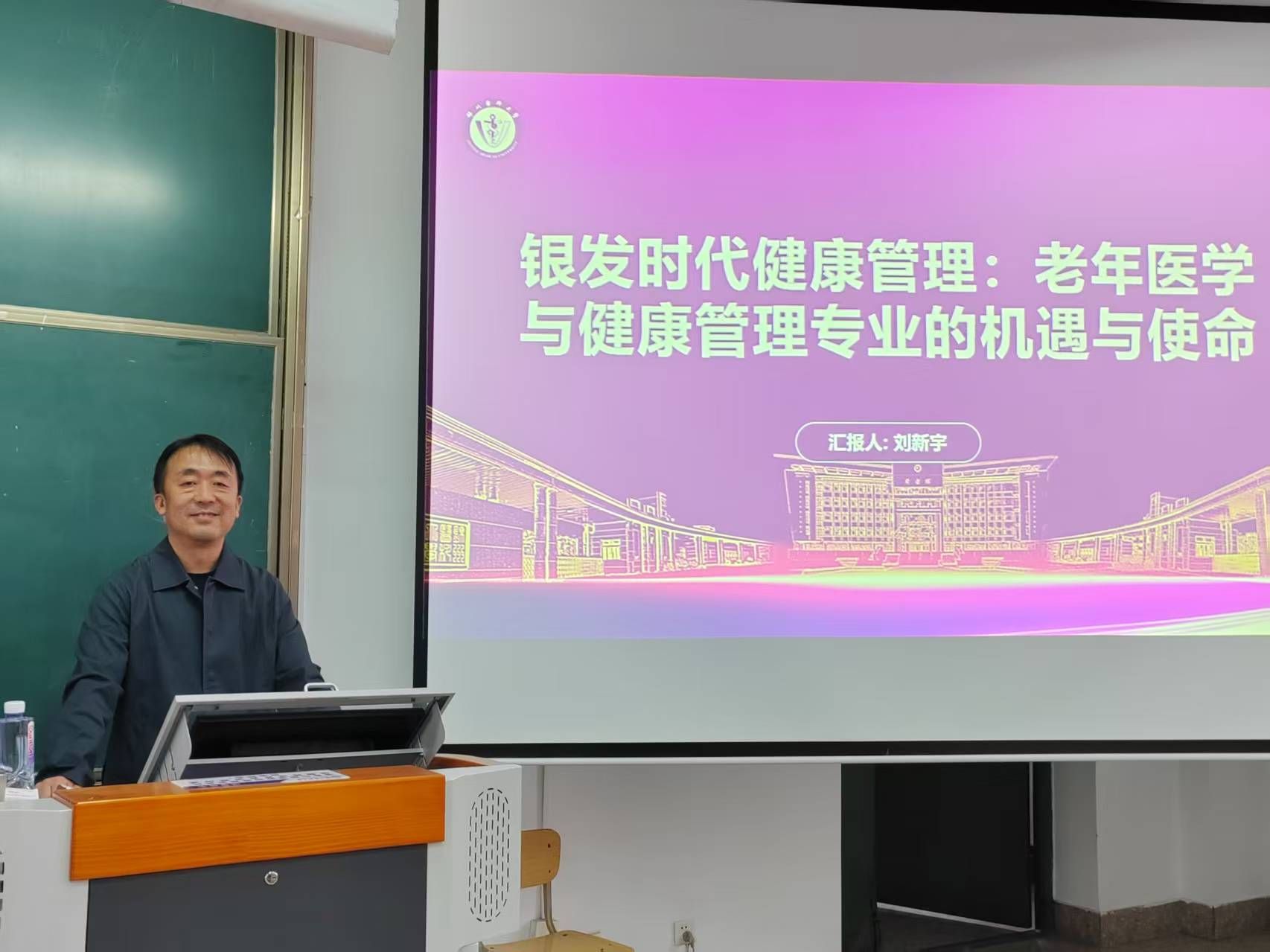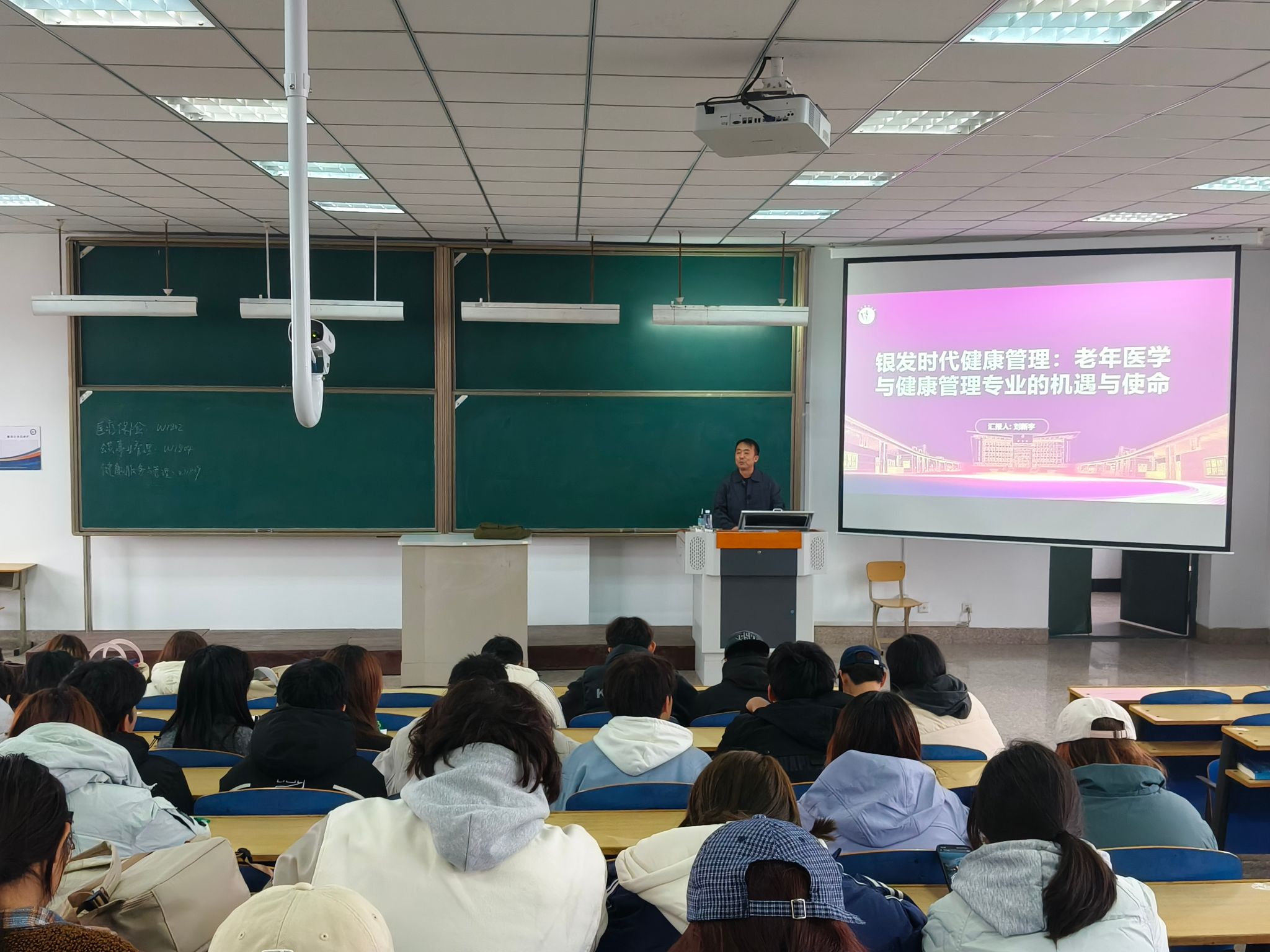 讲座伊始,刘教授首先系统梳理了我国人口老龄化的严峻现状与核心挑战,强调应对这一“银发浪潮”不仅是全社会面临的重大课题,也为老年医学与健康管理专业带来了历史性的发展机遇。接下来,刘教授用生动的案例揭示了现代医学在老龄化社会中的关键作用,以及健康管理专业的毕业生未来将在各级医疗机构、康养社区、健康科技企业及保险等领域获得更加广阔的就业前景。最后,刘教授对在场学子提出了殷切期望,阐述了新时代医学生的职业使命,鼓励大家 “拥抱银发时代” ,将个人职业发展融入国家“健康中国”战略,用专业知识与人文关怀去守护亿万长者的生命尊严与晚年幸福,为推动构建老年友好型社会贡献自己的力量。