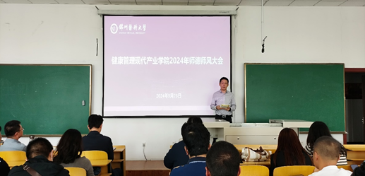9月25日下午,健康管理现代产业学院召开学院师德教育大会,学习《新时代高校教师职业行为十项准则》等法律法规,并进行违反准则案例警示教育。