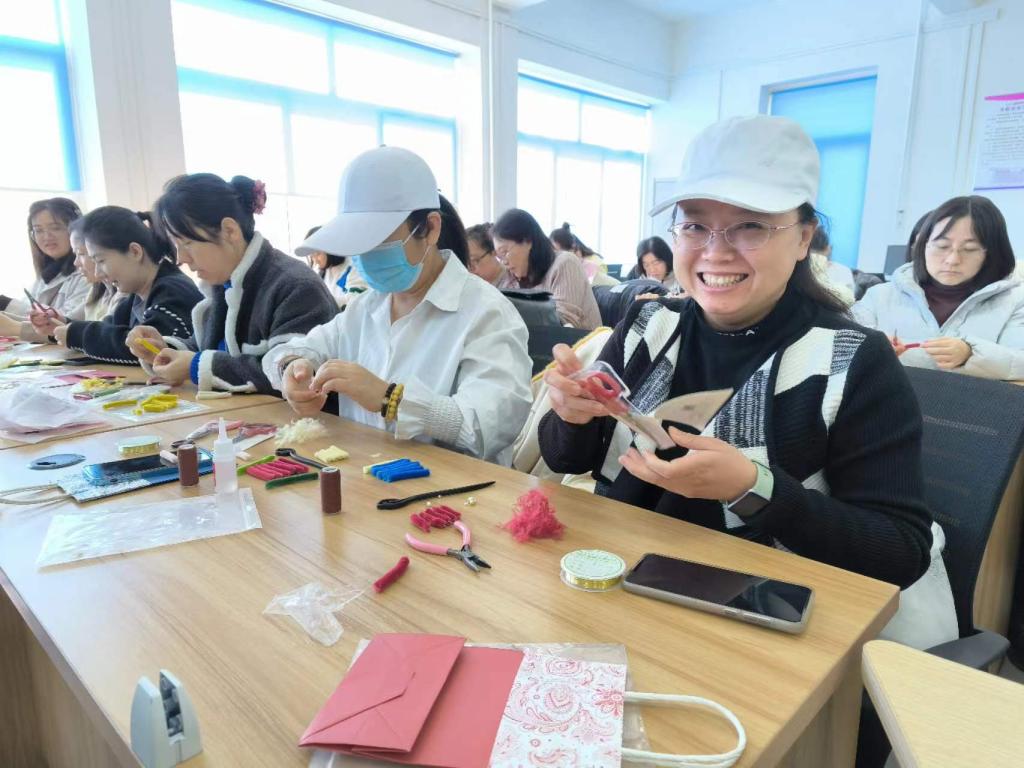 女教职工在史老师的讲解指导下,将手中的绒棒逐渐形成了花瓣、组成了花朵、折出了树叶、缠出了枝丫……场内充满幸福的欢笑。一支支精美的发簪,来自一颗颗美丽的心灵。随着各具美感的作品不断完成,本次活动圆满结束。