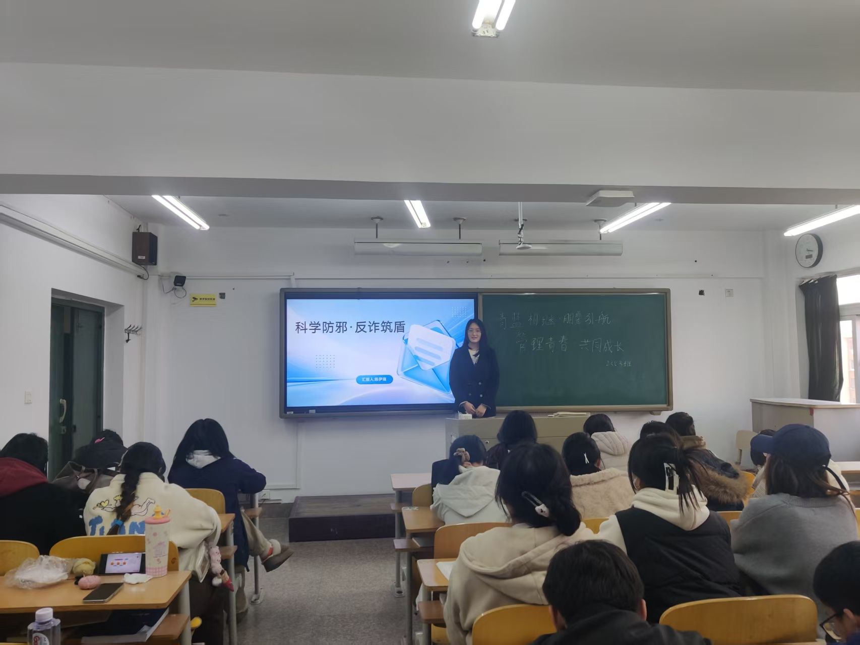 在活动中,各班级涌现出诸多亮点。例如,2023级51班的魏晴玉同学结合管理学知识,分享大学目标设定、时间管理等实操经验;吕祯雪同学剖析邪教本质与电诈防范策略,倡导宿舍安全自查;邢彩琴同学讲述抗战英雄事迹,阐释伟大抗战精神。2023级52班的卫俊杰同学作为发展对象,分享医保专业学习与党员标准践行经验;吴研同学探讨党的宗旨在新时代的深化与实践。2023级53班通过红色教育、邪教剖析和消防知识问答游戏,提升学生风险应对能力和心理调适能力。2024级50班的罗晓宇、郝宝仪和伊品怡同学分别分享党校体会、消防安全知识和多维安全防范策略。2024级51班解读校园安全风险与红色精神传承,形成安全韧性共识。2024级52班通过发言稿形式,强调自我管理方法、安全防线构建及抗战精神传承。