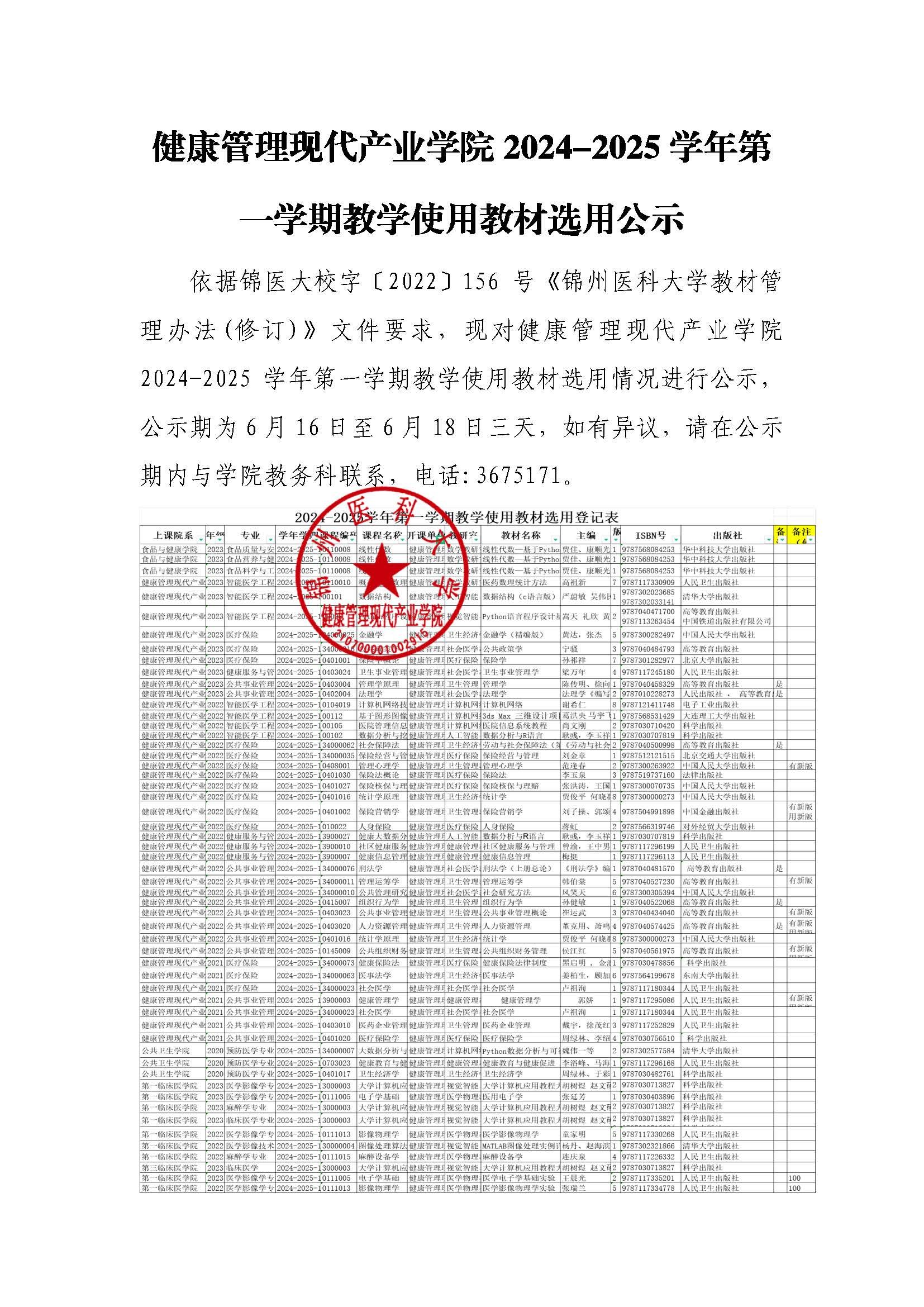 学院 2024-2025 学年第一学期教学使用教材选用公示